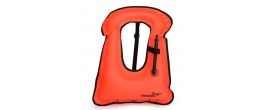 Slip the vest on, adjust the straps, and inflate using the oral inflation tube when needed.